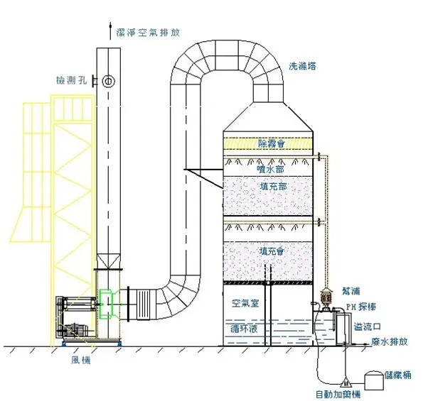 濕式除塵塔工作原理:廢氣由離心通風機吸入塔體,經由進口的預噴淋系統除塵降溫,經預處理后的氣體進入填料層,水溶液由泵從循環水箱提升至塔頂,由螺旋噴嘴噴淋后附著在填料表面,由填料表面形成的液膜完成主要的收集工作,填料較大的比表面積提供氣相及固相間的物質傳導。經填料層處理后的氣體流經除霧段阻隔并收集霧氣后,排入大氣中。煙囪出口粉塵量驗收標準參照《北京市大氣污染綜合排放標準》DB11501-2017。