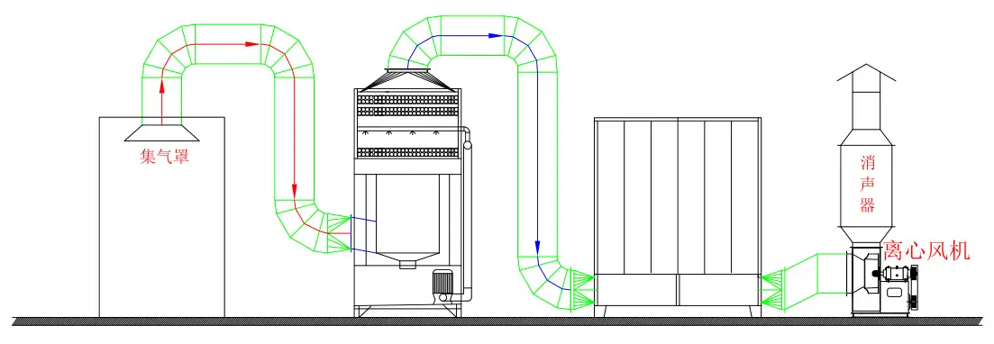 當生產作業時,煙塵廢氣在風機牽引力的作用下進入高速混流導軌裝置,煙塵廢氣在離心力的作用下進行氣液乳化反應,在混流液的高速旋轉狀態下,污染物與旋轉液體充分混合吸收相溶增加煙塵比重,利用旋流裝置設計好的離心力達到氣液分離分離后的氣體進入環保填料吸附層,螺旋噴頭噴出的對應溶劑均勻分布在填料上,由于填料的合理設計,污染物浸透在填料的時間較長,與反應液在專用環保填料表面有充分的氣液相溶反應時間從而達到達標排放的目的。