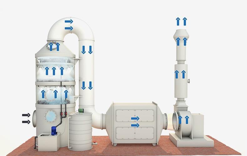 具體地:噴涂后的廢物先經(jīng)過霧化洗滌塔.霧化洗滌塔是由多層帶孔纖維層組成.并且從第一層開始以后每層單位面積內(nèi)孔數(shù)變多。當(dāng)廢氣通過洗滌塔時,廢氣中的細(xì)微顆粒、漆霧及一小部分有機物不斷與微孔發(fā)生碰撞,粘合,細(xì)微顆粒不斷細(xì)化并且一級一級不斷被粘附,最終被全部粘合。