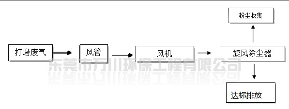二樓的切削打磨屬于粉塵廢氣,打磨拋光時所產(chǎn)生的粉塵通過收集由引風(fēng)機(jī)抽至車間外。本方案設(shè)計設(shè)粉塵廢氣處理系統(tǒng)二套,處理能力為15000m3/h,系統(tǒng)設(shè)于車間一樓。