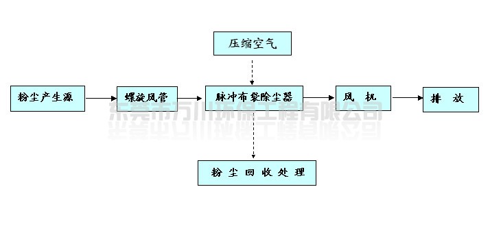 含塵廢氣在風(fēng)機(jī)作用下,通過風(fēng)管收集進(jìn)入脈沖布袋除塵器,含塵廢氣進(jìn)入中箱體下部,在擋風(fēng)板形成預(yù)分離室內(nèi),粉塵因慣性作用落入灰斗。廢氣沿?fù)躏L(fēng)板向上到達(dá)濾袋,粉塵被阻留在濾袋外面,干凈氣體進(jìn)入袋內(nèi),并經(jīng)過袋口和上箱體及風(fēng)機(jī)再排出。