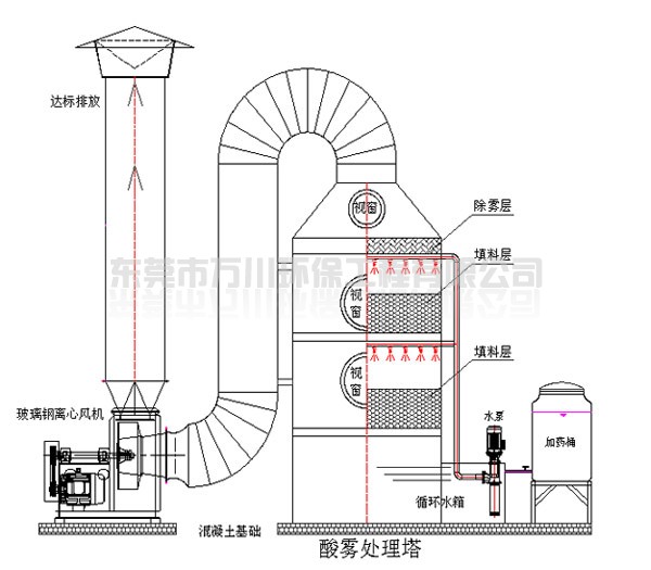 酸霧廢氣由風(fēng)管進(jìn)入酸霧處理塔,自下而上穿過填料層;循環(huán)堿液吸收劑由塔頂通過螺旋噴嘴,形成的水霧勻地噴淋到填料層中,沿著填料層表面向下流動,進(jìn)入循環(huán)水箱。由于上升氣流和下降霧化吸收劑(堿液)在填料中不斷接觸,上升氣體中流質(zhì)的濃度越來越低。使其酸霧得到凈化,達(dá)標(biāo)排放。